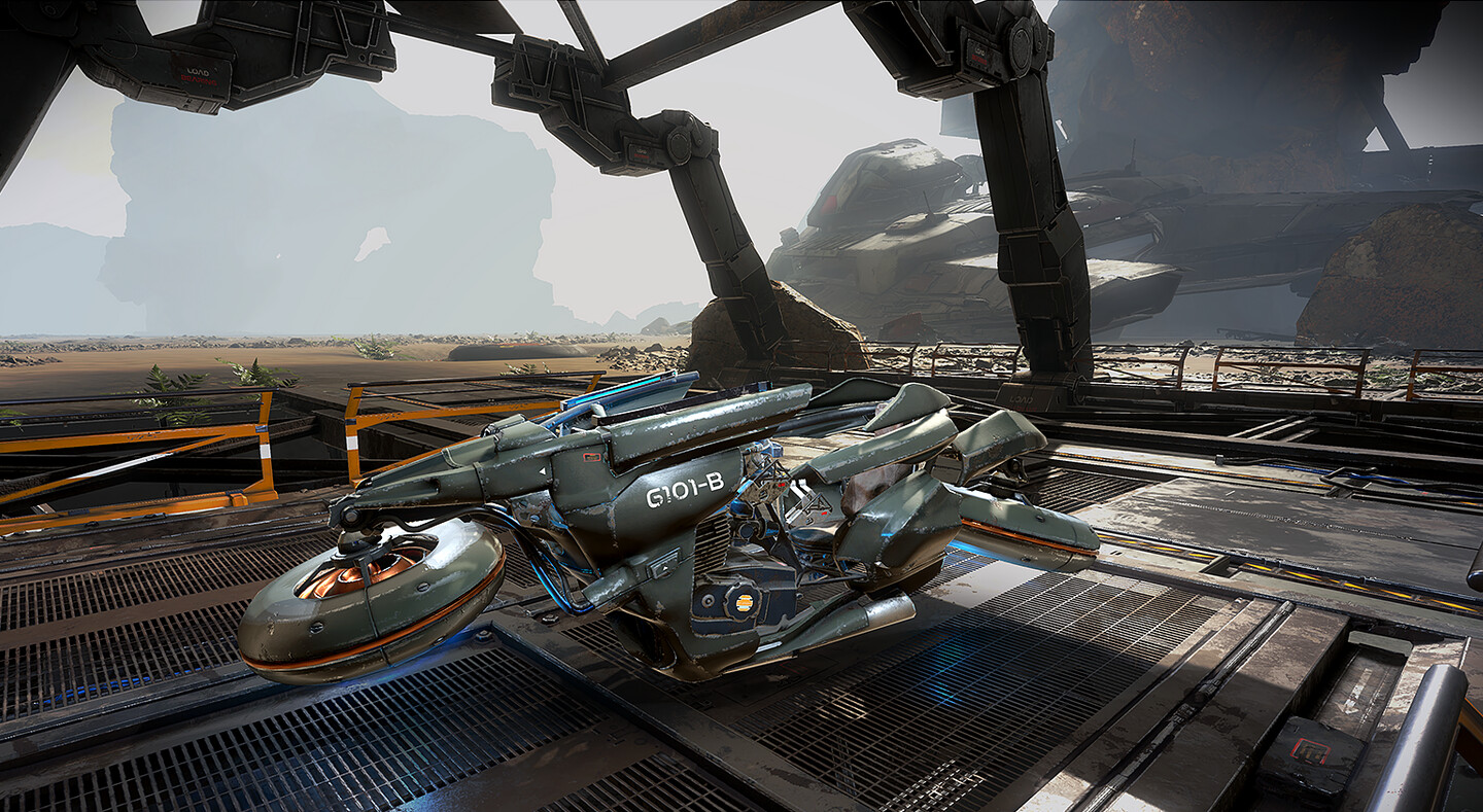 We ultimately transitioned over to a desert biome. The natural rock, ground assembly and sky were from a stock library, along with some HD source assets for cables and a few bulkheads. Everything else was made by us such as the character clothes, equipment, vehicles, props, weapons and environment architecture.